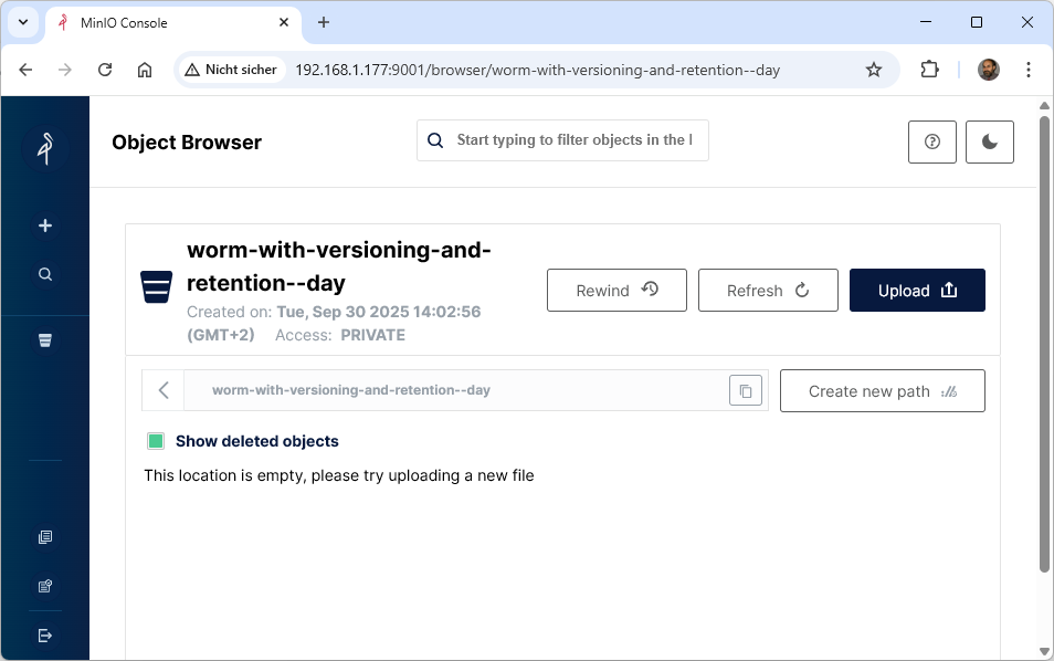 root@pve-pdman-01:~# mc mb –with-lock myminio/worm-with-versioning-and-retention–day
