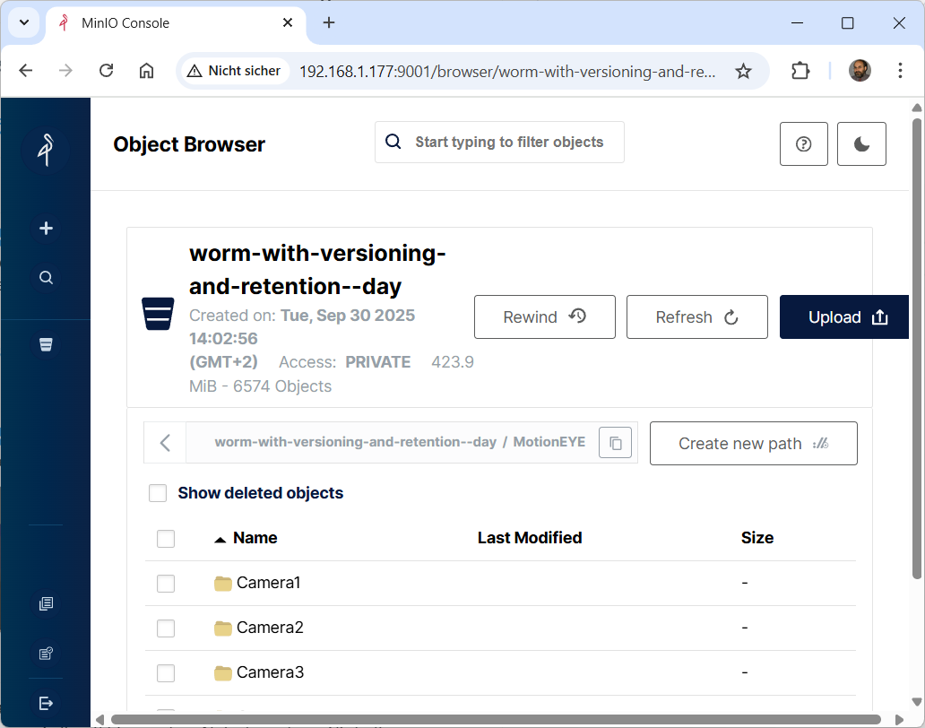 Bucket created successfully `myminio/worm-with-versioning-and-retention–day`.