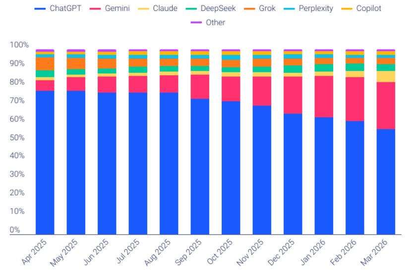 April 19th, 2026Gen AI Website Traffic Share – last 12 Month as of March 2026