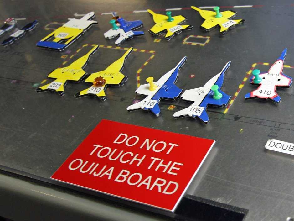 The Ouija Board vital on US Aircraft Carrier – is a waist-high replica of the flight deck at 1/16 scale to the foot that has all the markings of the flight deck as well as its full compliment of aircraft all in cutouts and all tagged with items like thumbtacks and bolts to designate their status
