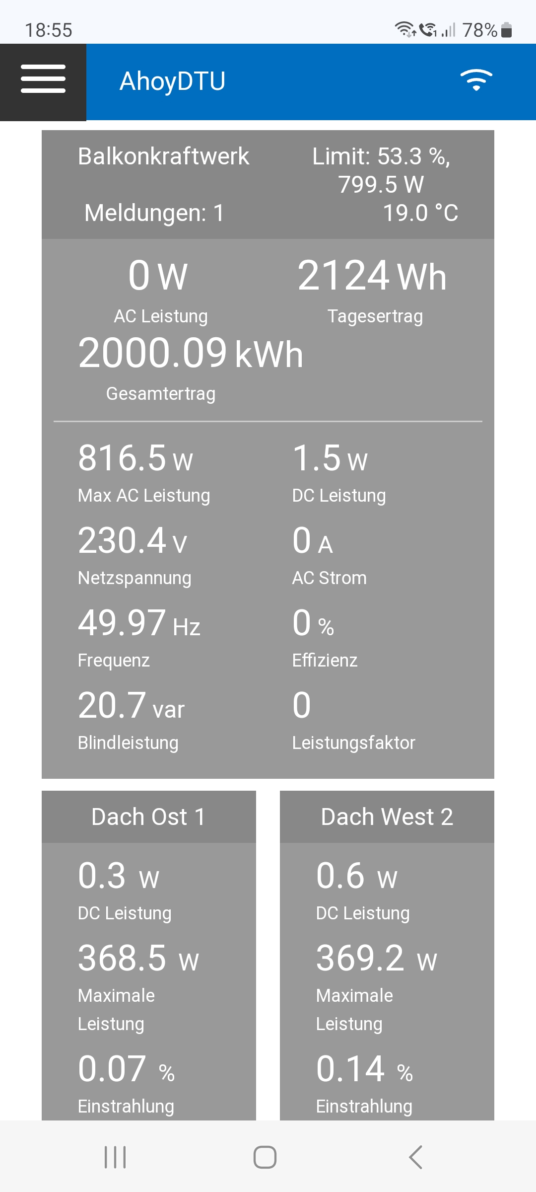 Wechselrichter Hoymiles-HM-1500 – 2.000 kWh mit 4 Modulen a 425 W in Ost/West Ausrichtung seit dem 01.07.2023 geerntet
