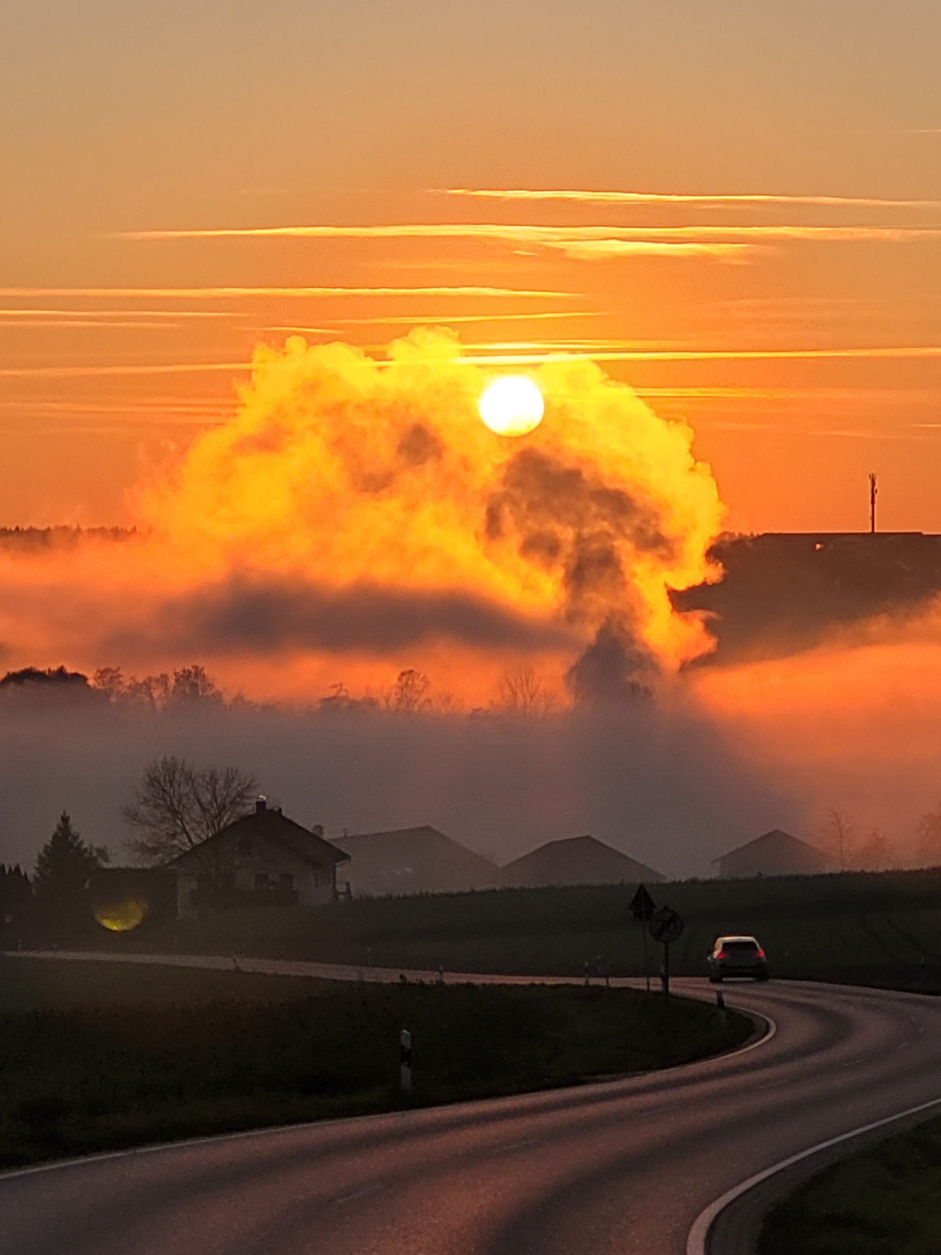 Sonntag, November 17th, 2024Auf dem Weg von St. Wolfgang nach Isen – eine Industriewolke einer Ziegelei verdeckt die Sonne am Boden ist der Nebel natürlich
