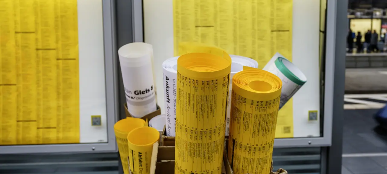 Donnerstag, November 28th, 2024Ab dem 15.12.2024 verzichtet die Deutsche Bahn zunächst auf die weißen Aushänge für die Ankunftspläne an den Bahnhöfen die gedruckten gelben Abfahrtspläne sollen vorerst Bestand haben
