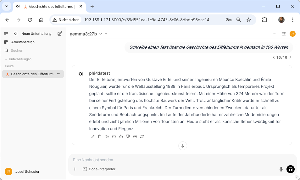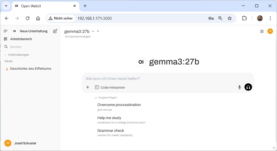 58b9699562f4 ghcr.io/open-webui/open-webui:main „bash start.sh“ 8 minutes ago Up 8 minutes (healthy) 0.0.0.0:3000->8080/tcp, [::]:3000->8080/tcp open-webui