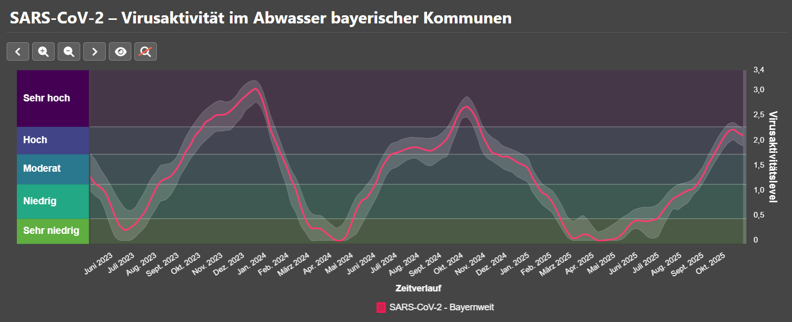Die bayernweite Virusaktivität wird aus den Messergebnissen aller 21 beprobten Abwasserstandorte in Bayern berechnet