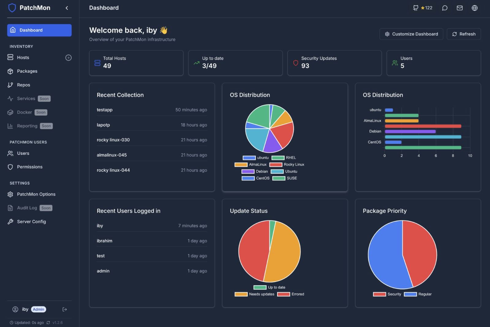 PatchMon – provides centralized patch management across diverse server environments and agents communicate outbound only to the PatchMon server eliminating inbound ports on monitored hosts while delivering comprehensive visibility and safe automation ans supports a wide range of Linux versions including Ubuntu Debian CentOS RHEL and Fedora