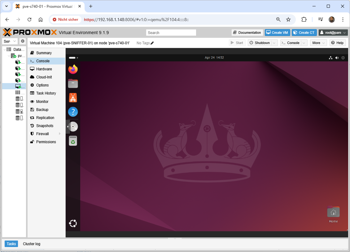 Freitag, April 24th, 2026Proxmox Virtual Environment (VE) 9.1.9 – Ubuntu 24.04 LTS Desktop (Noble Numbat) requires a 64bit 2 GHz dual core processor 4 GB of RAM is strongly recommended and 25 GB of storage for a standard installation