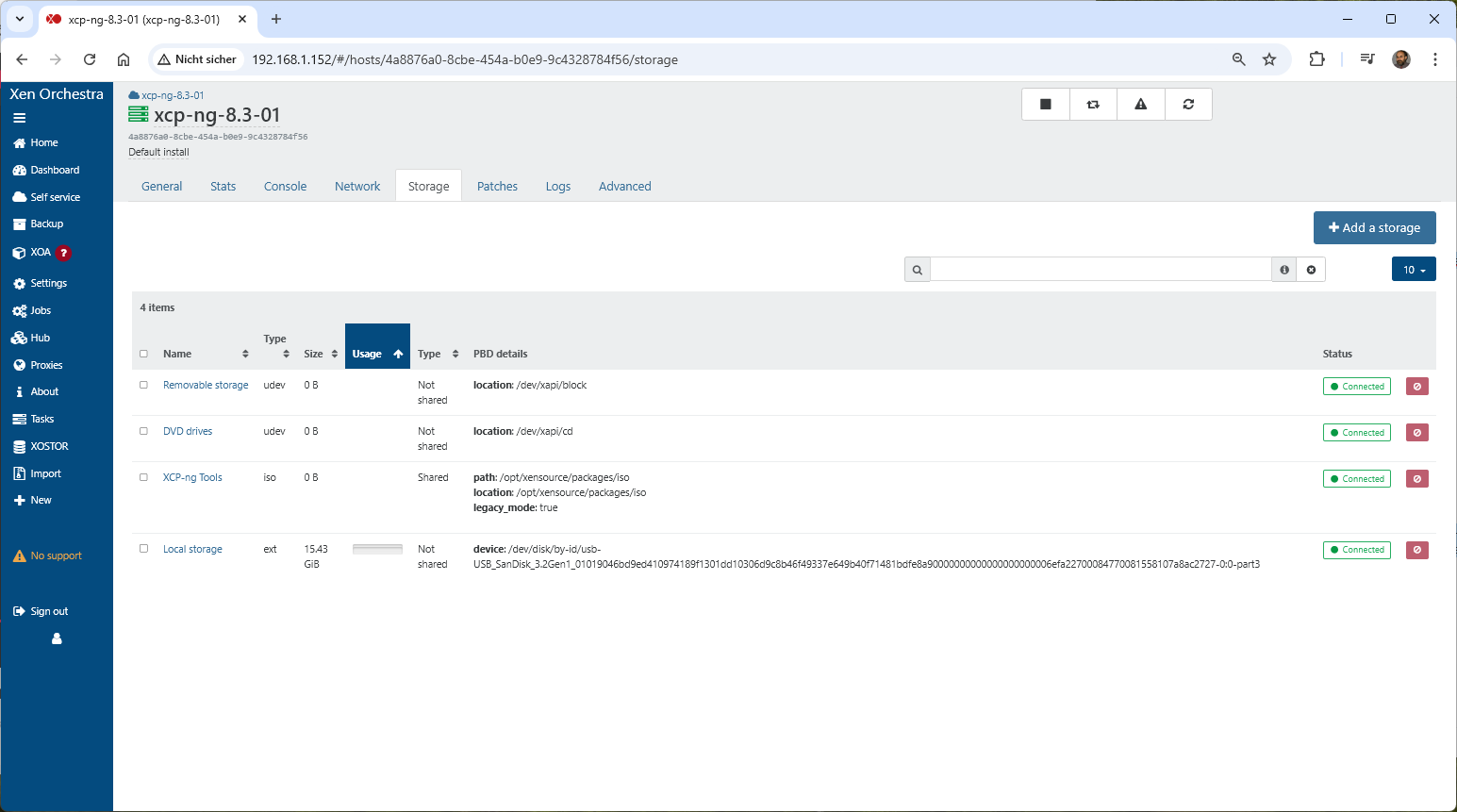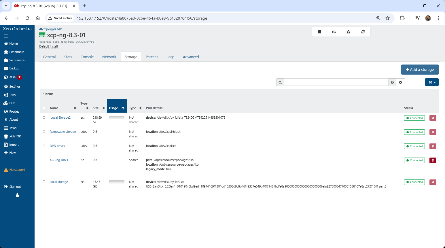 [12:15 xcp-ng-8 ~]# xe sr-create content-type=user device-config:device=/dev/sda host-uuid=4a8876a0-8cbe-454a-b0e9-9c4328784f56 name-label=“Local Storage2″ shared=false type=ext
