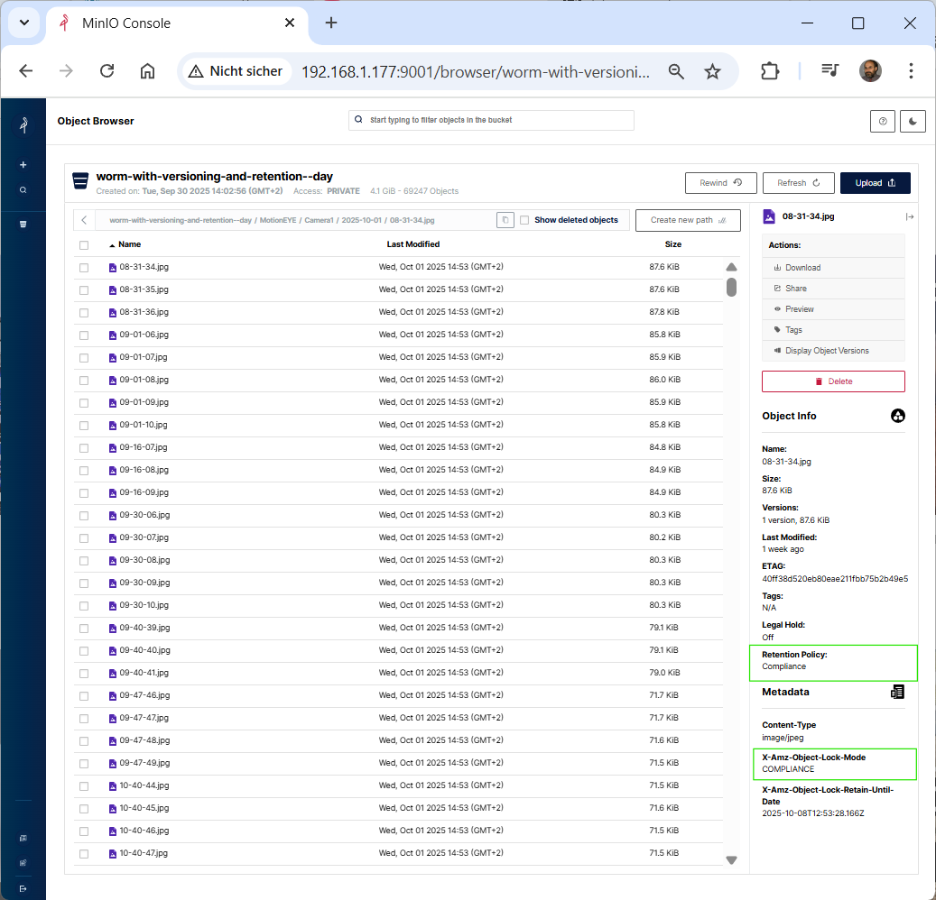 Object locking ‚COMPLIANCE‘ is configured for 7DAYS.