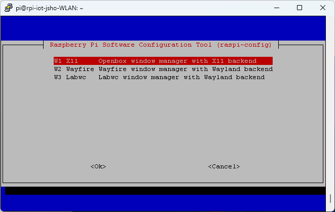 root@rpi-iot-jsho-WLAN:~# raspi-config ‚ – ‚6 Advanced Options‘ – ‚A6 Wayland‘ – ‚W1 X11‘
