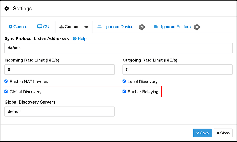 How to keep Syncthing restricted to my local network you have to disable ‚Global Discovery‘ and ‚Enable Relaying‘